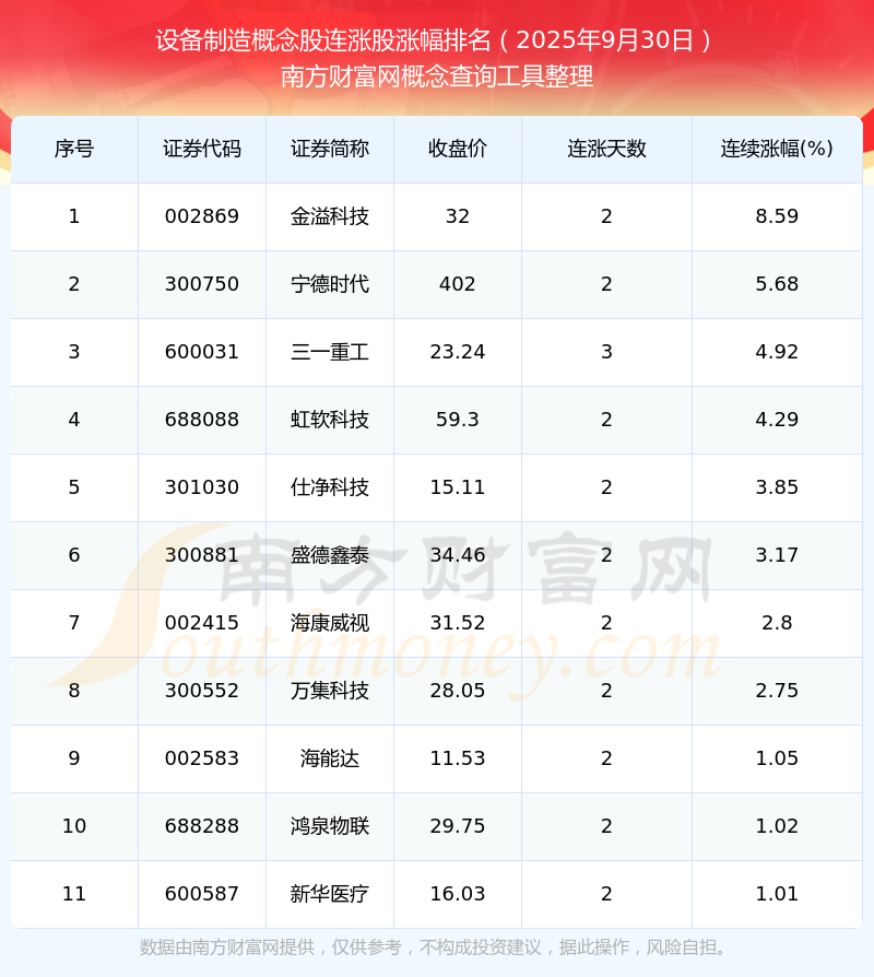 2025年9月30日設(shè)備制造概念股連漲股漲幅排名