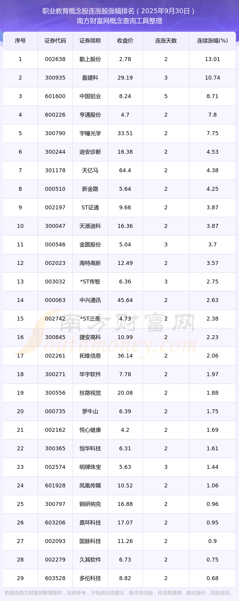 2025年9月30日職業(yè)教育概念股連漲股漲幅排名