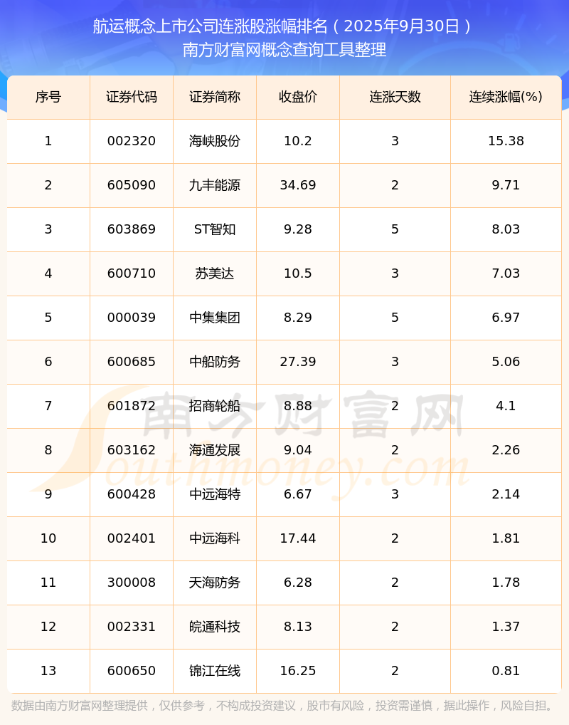 根據(jù)南方財(cái)富網(wǎng)概念查詢(xún)工具數(shù)據(jù)統(tǒng)計(jì),截止2025年9月30日收盤(pán),航運(yùn)概念上市公司共有13只個(gè)股實(shí)現(xiàn)連漲。其中連續(xù)漲幅較大的個(gè)股有海峽股份、九豐能源、ST智知等,連續(xù)漲幅分別為15.38%、9.71%、8.03%。