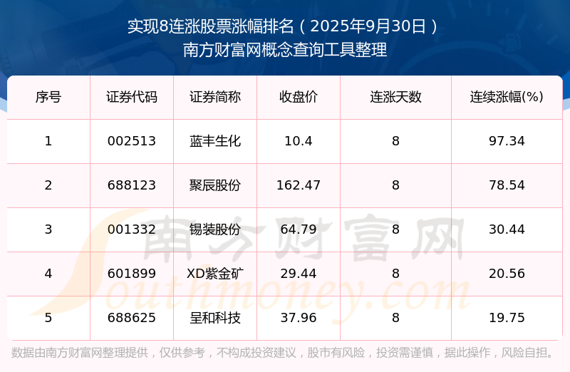 2025年9月30日實現(xiàn)8連漲股票漲幅排名