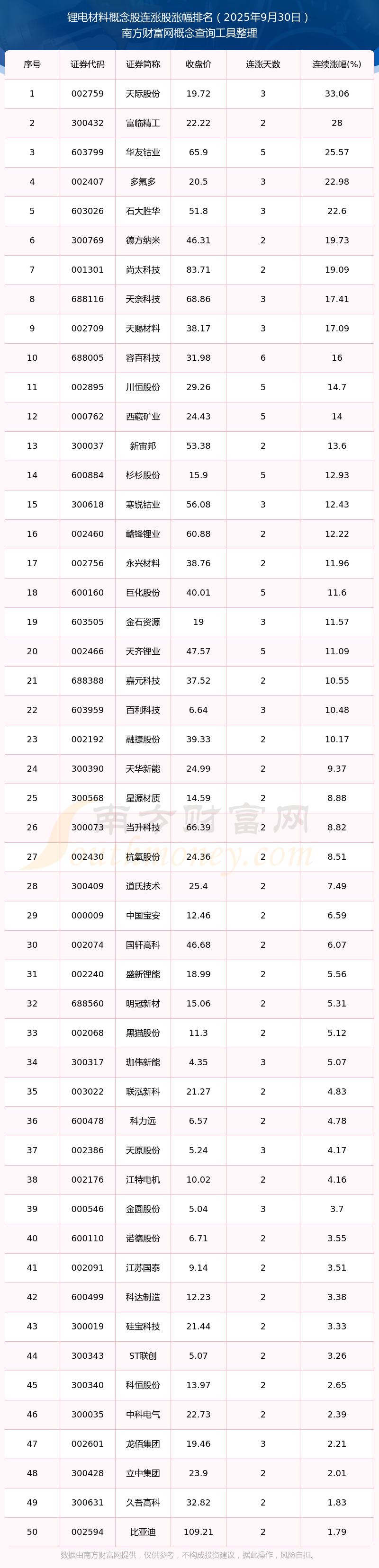 2025年9月30日鋰電材料概念股連漲股漲幅排名