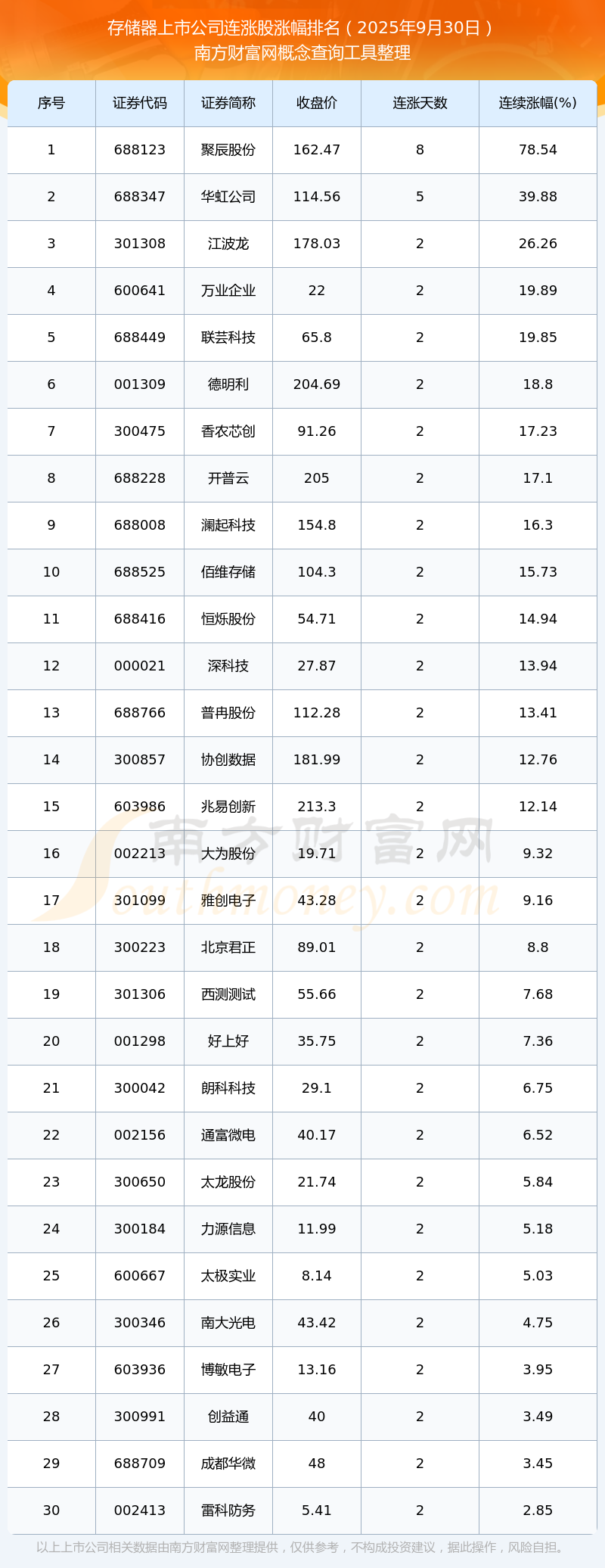2025年9月30日存儲器上市公司連漲股漲幅排名