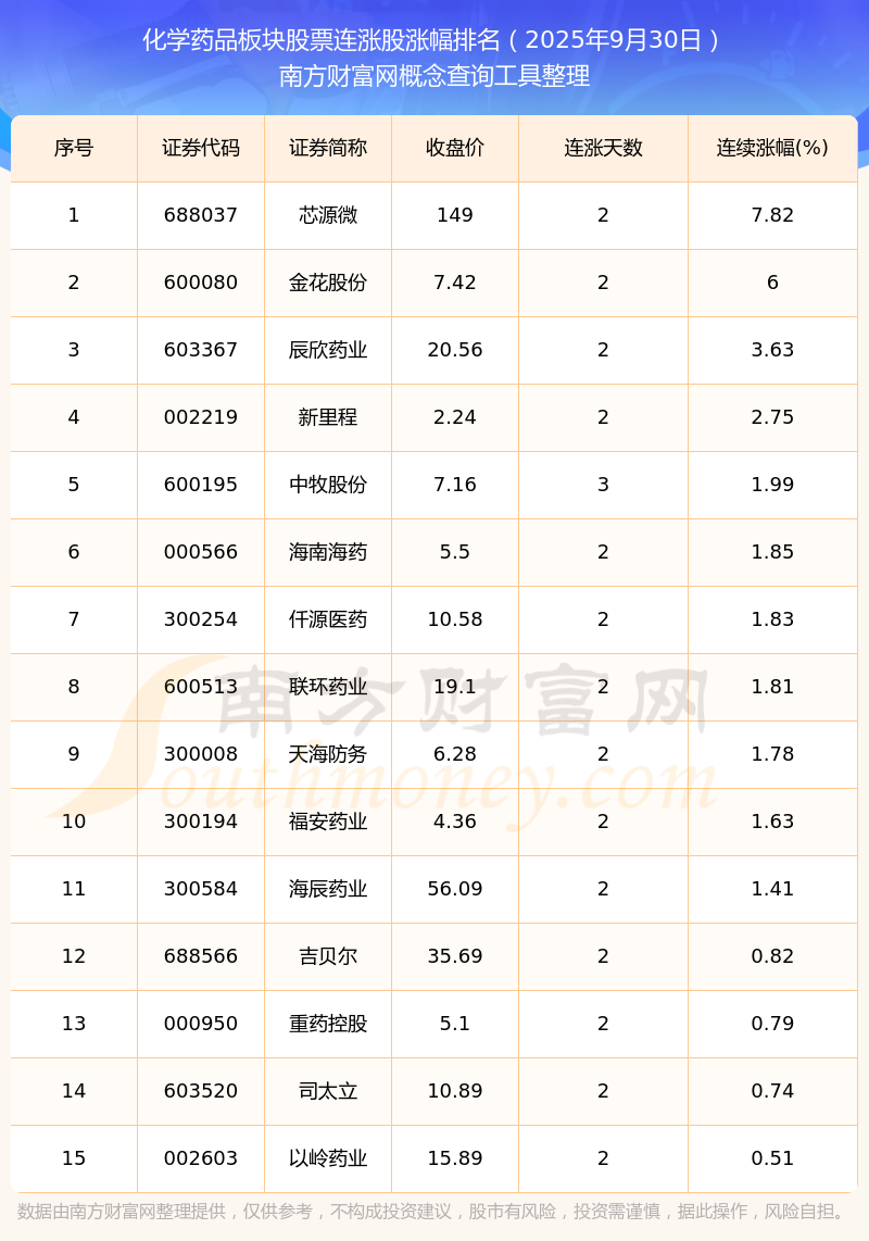 2025年9月30日化學(xué)藥品板塊股票連漲股漲幅排名