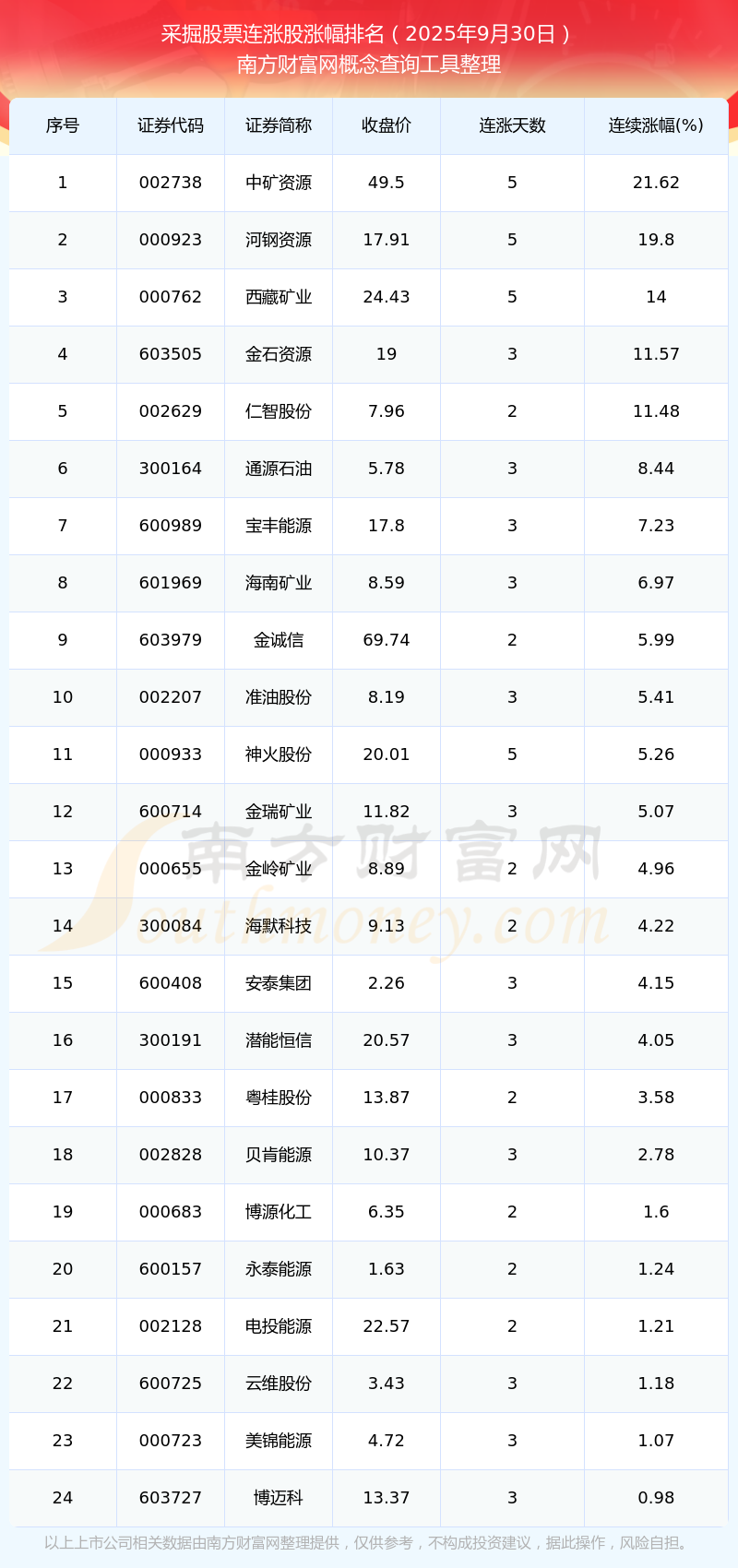 根據(jù)南方財富網概念查詢工具數(shù)據(jù)統(tǒng)計,截止2025年9月30日收盤,采掘股票共有24只個股實現(xiàn)連漲。其中連續(xù)漲幅較大的個股有中礦資源、河鋼資源、西藏礦業(yè)等,連續(xù)漲幅分別為21.62%、19.80%、14.00%。