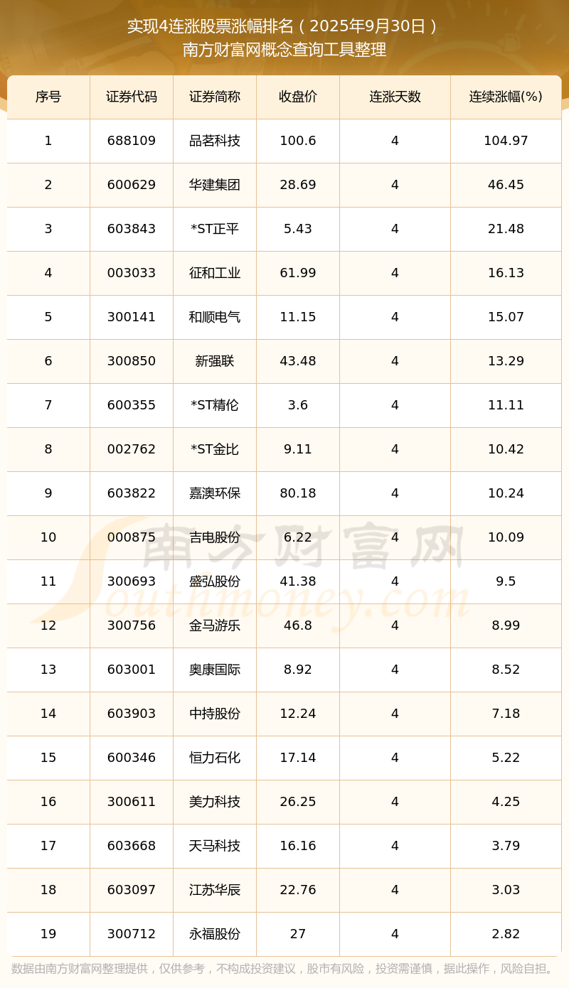 2025年9月30日實現(xiàn)4連漲股票漲幅排名