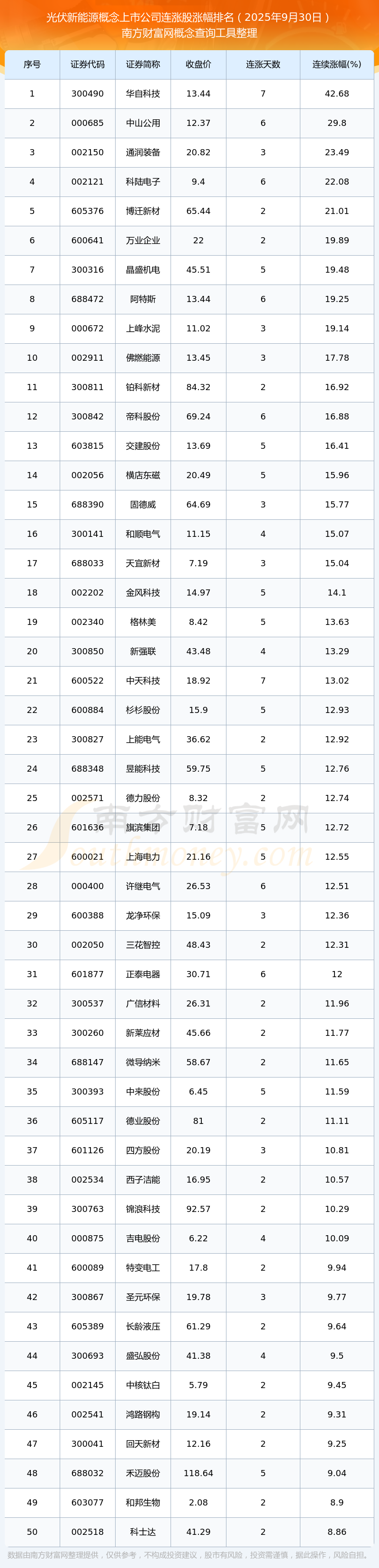 2025年9月30日光伏新能源概念上市公司連漲股漲幅排名
