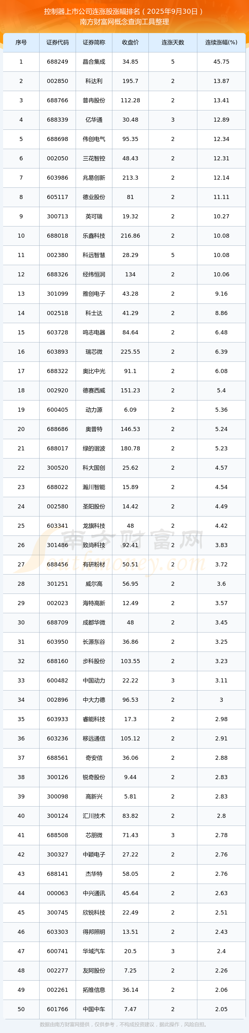 2025年9月30日控制器上市公司連漲股漲幅排名