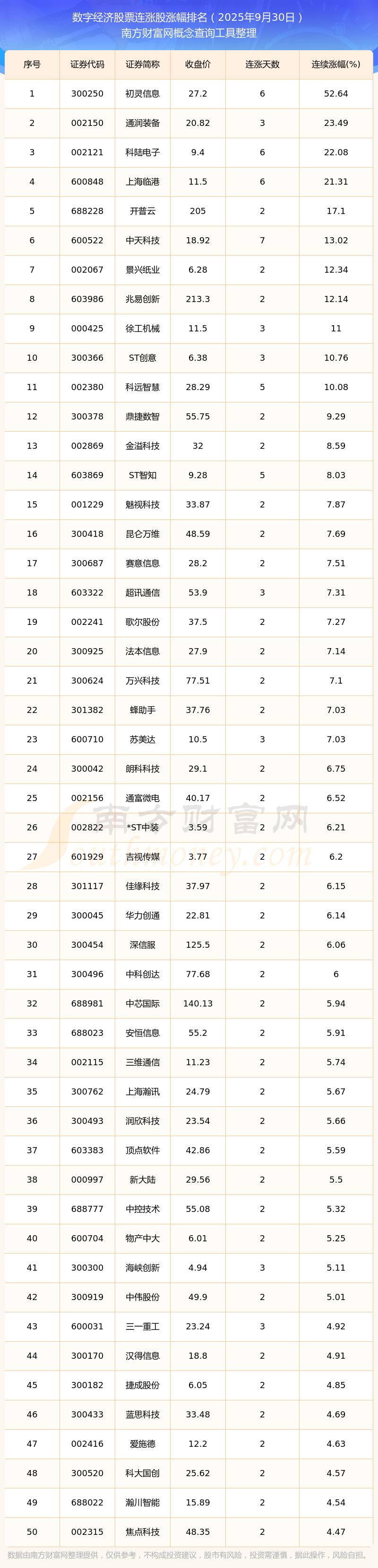 2025年9月30日數(shù)字經(jīng)濟(jì)股票連漲股漲幅排名