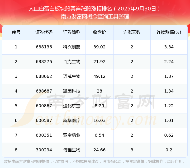 2025年9月30日人血白蛋白板塊股票連漲股漲幅排名