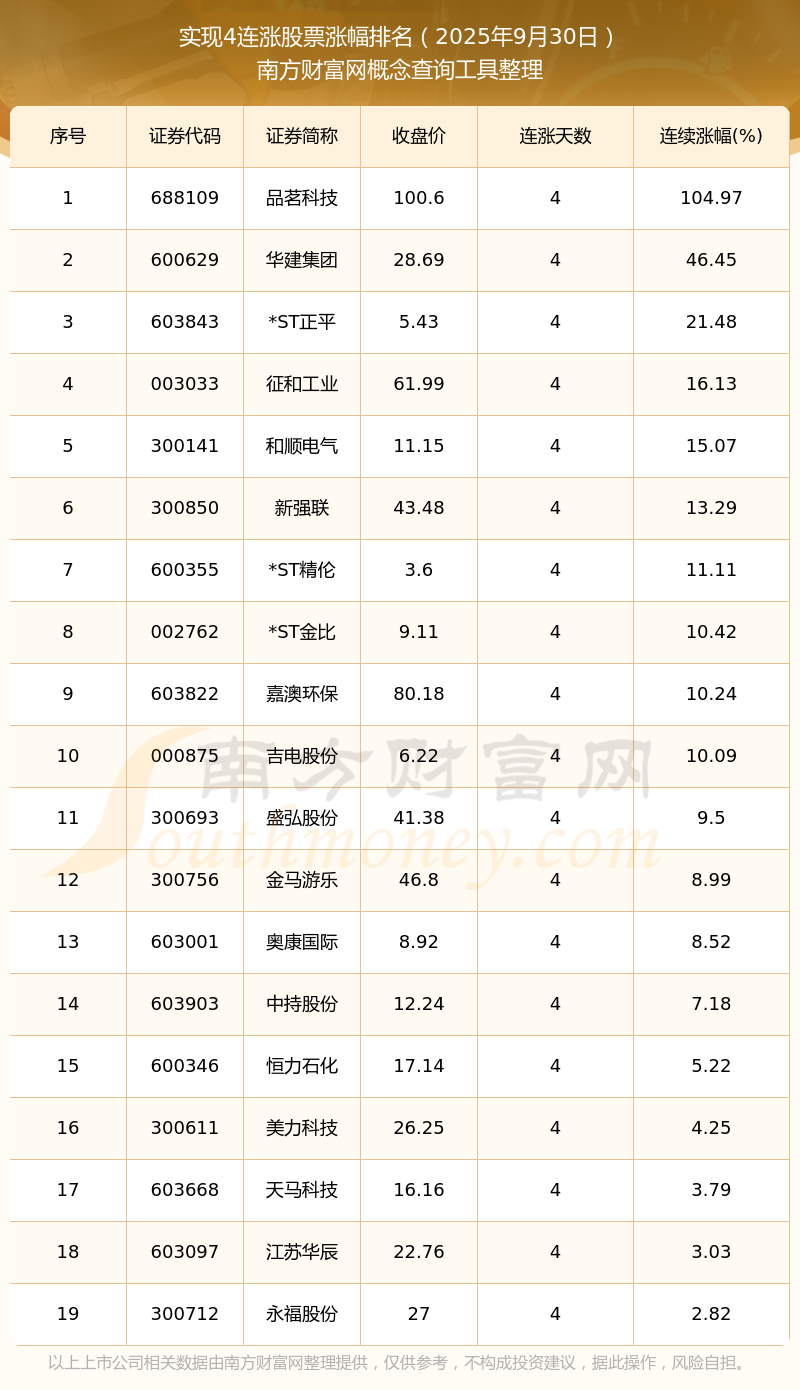 今日股市消息:19只個(gè)股實(shí)現(xiàn)4連漲(2025年9月30日)