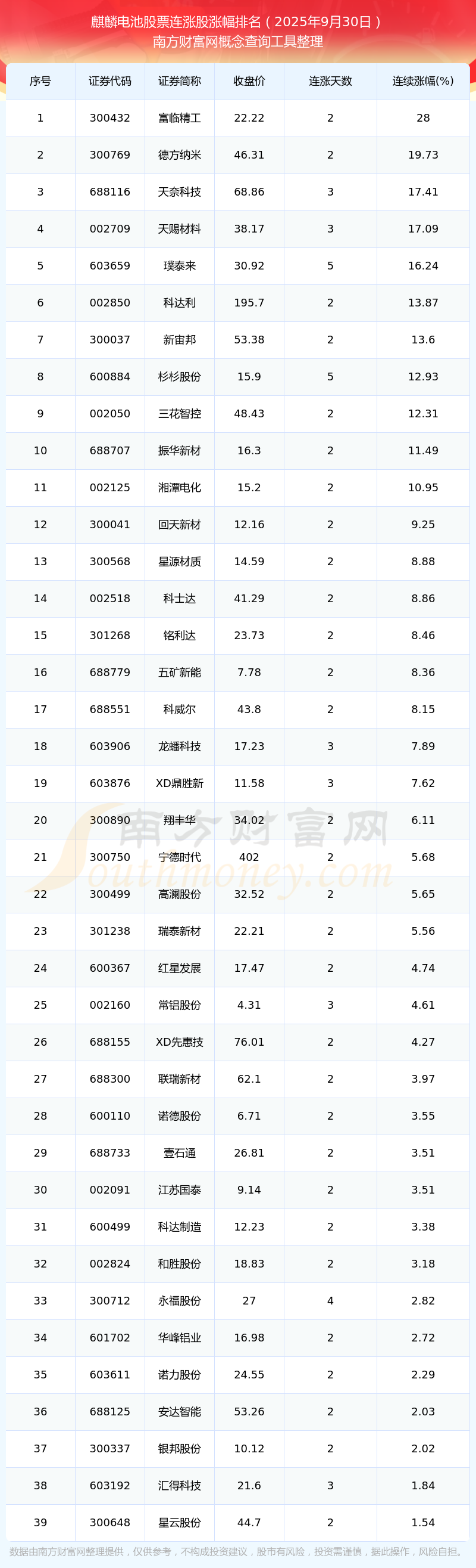 2025年9月30日麒麟電池股票連漲股漲幅排名