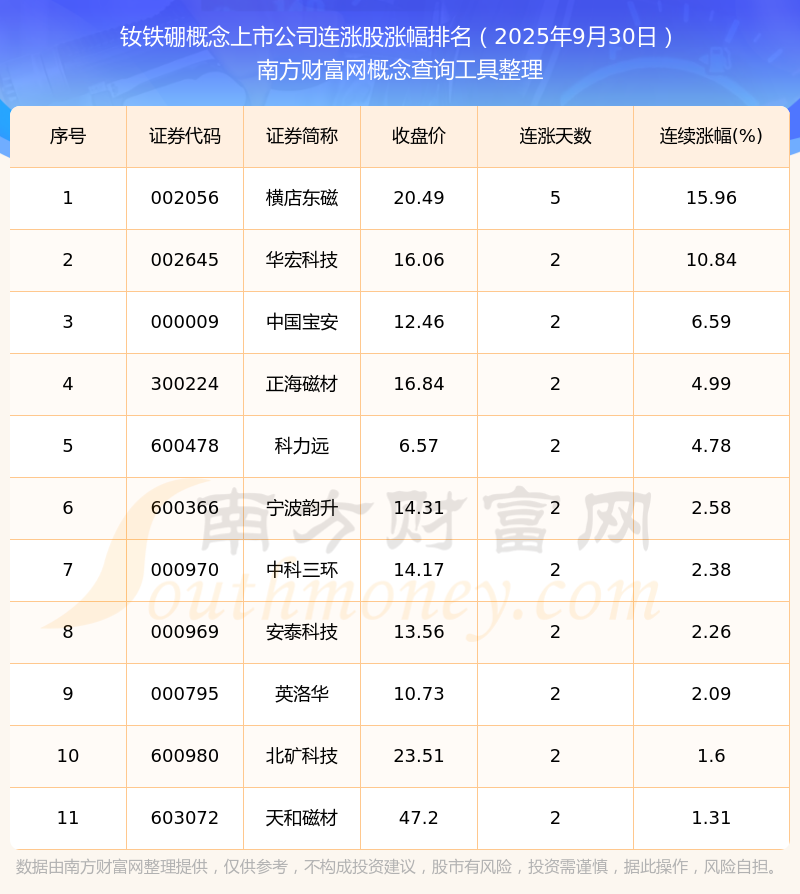 2025年9月30日釹鐵硼概念上市公司連漲股漲幅排名