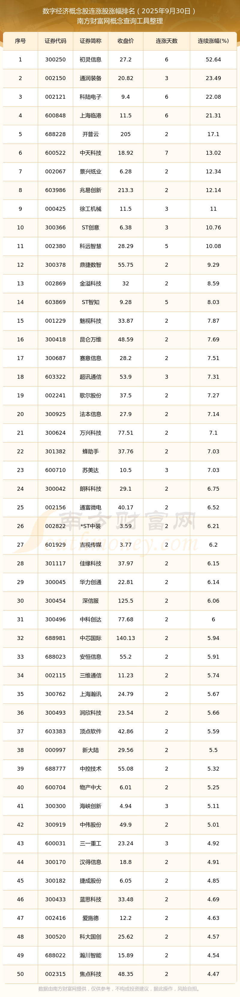 2025年9月30日數(shù)字經(jīng)濟(jì)概念股連漲股漲幅排名