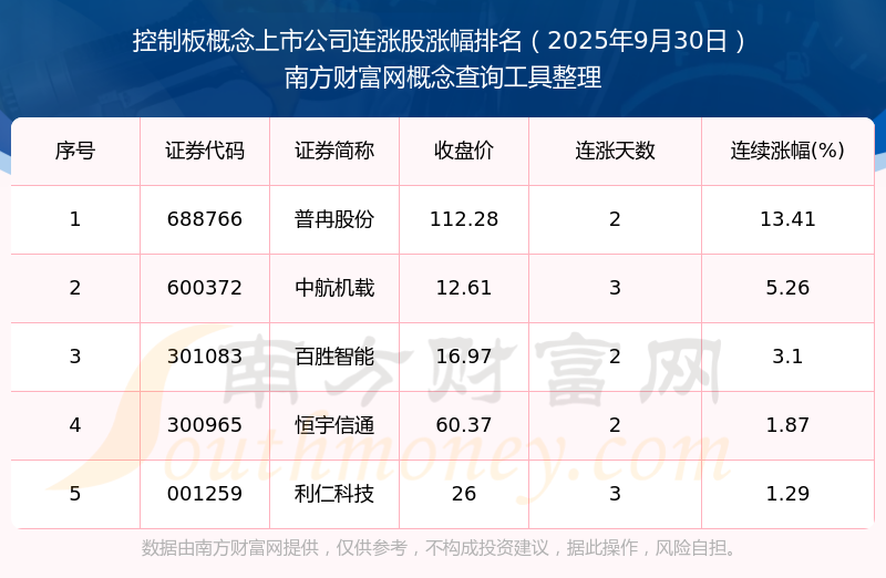 2025年9月30日控制板概念上市公司連漲股漲幅排名
