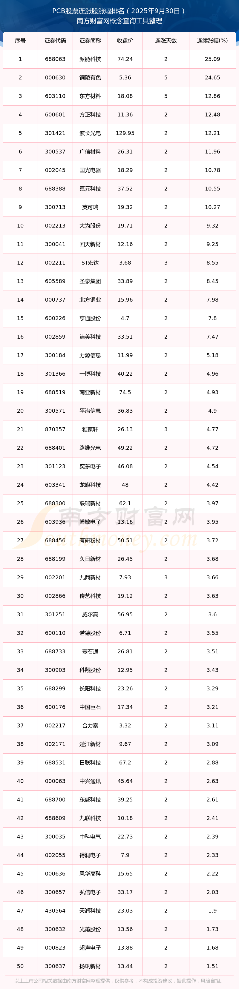 根據(jù)南方財(cái)富網(wǎng)概念查詢(xún)工具數(shù)據(jù)統(tǒng)計(jì),截止2025年9月30日收盤(pán),PCB股票共有62只個(gè)股實(shí)現(xiàn)連漲。其中連續(xù)漲幅較大的個(gè)股有派能科技、銅陵有色、東方材料等,連續(xù)漲幅分別為25.09%、24.65%、12.86%。