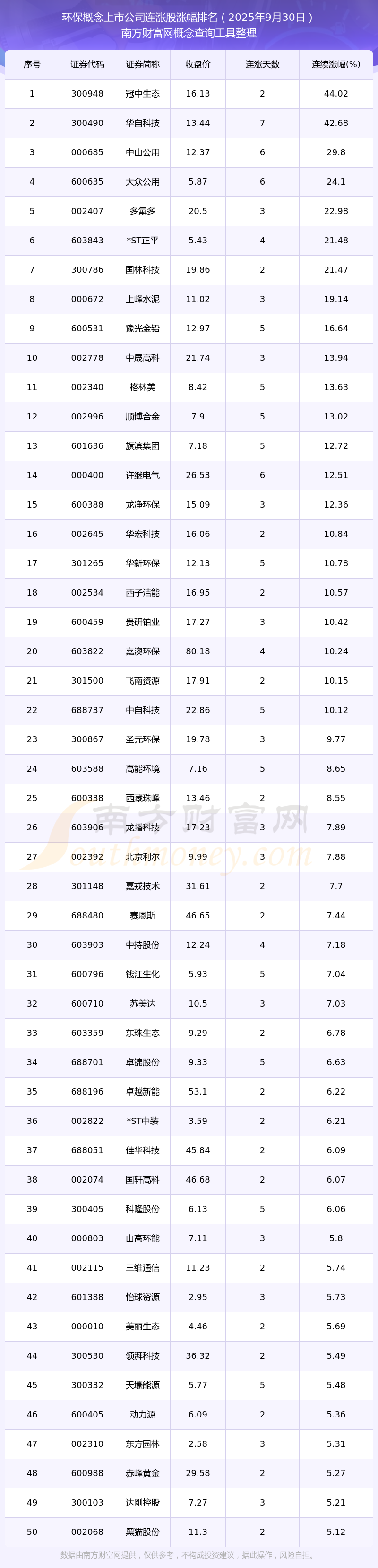 2025年9月30日環(huán)保概念上市公司連漲股票漲幅排名
