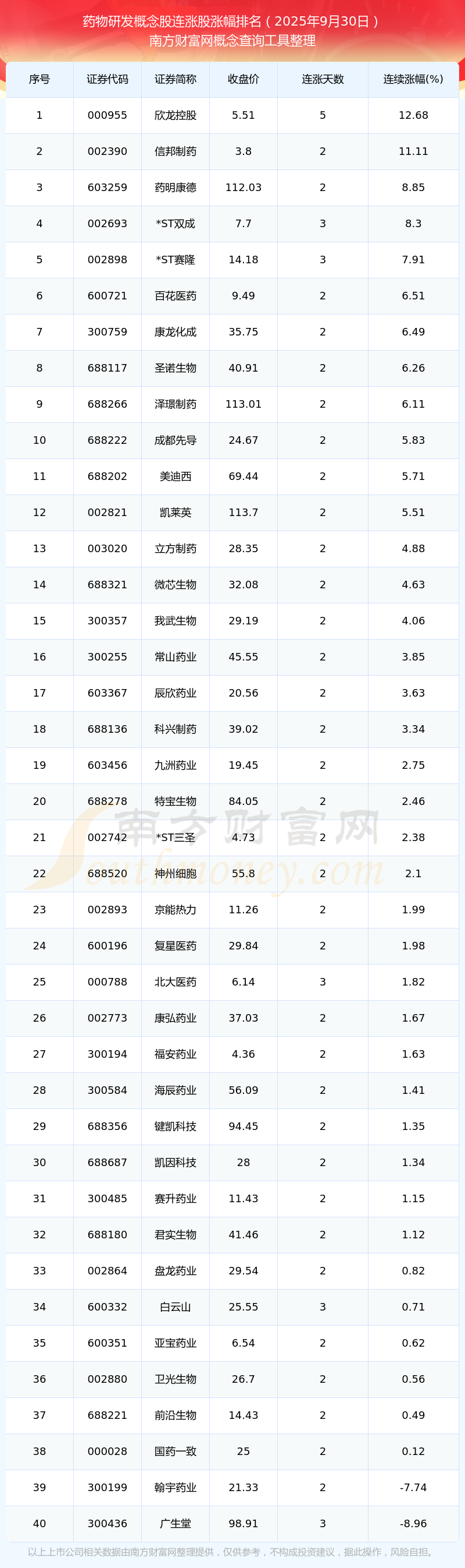 根據(jù)南方財(cái)富網(wǎng)概念查詢工具數(shù)據(jù)統(tǒng)計(jì),截止2025年9月30日收盤,藥物研發(fā)概念股共有40只個(gè)股實(shí)現(xiàn)連漲。其中連續(xù)漲幅較大的個(gè)股有欣龍控股、信邦制藥、藥明康德等,連續(xù)漲幅分別為12.68%、11.11%、8.85%。