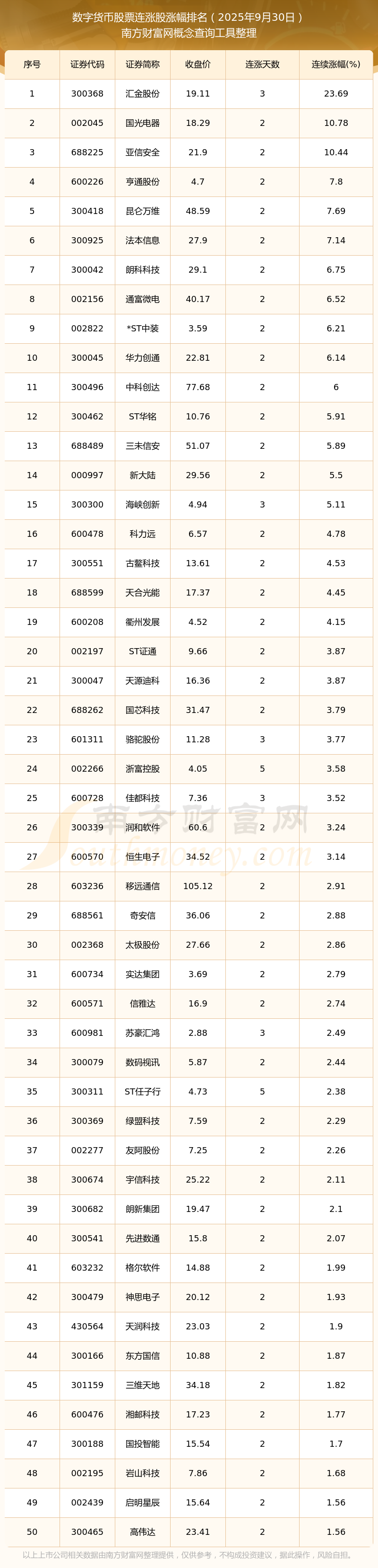 2025年9月30日數(shù)字貨幣股票連漲股漲幅排名