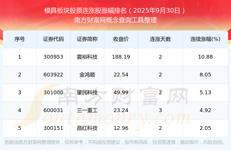 2025年9月30日模具板塊股票連漲股漲幅排名