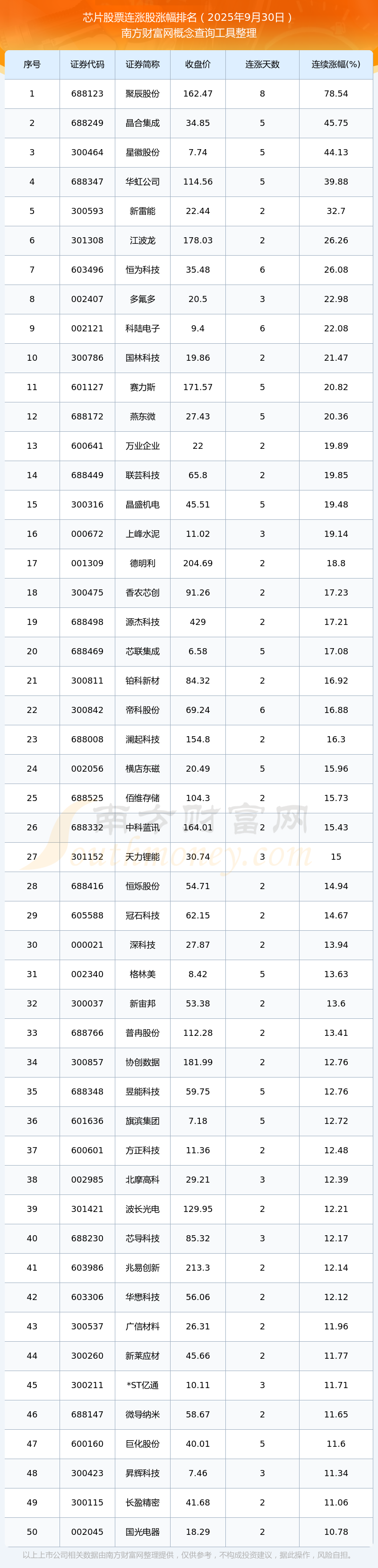 2025年9月30日芯片股票連漲股漲幅排名
