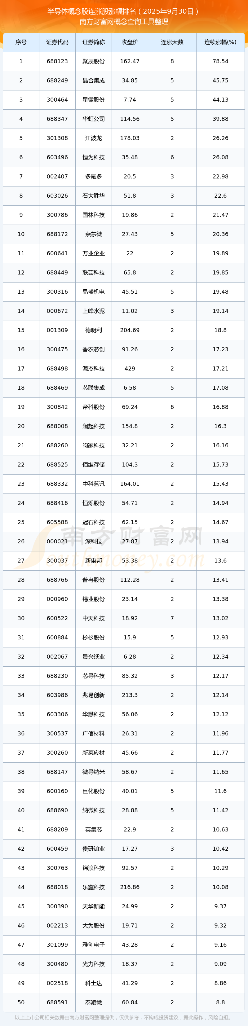 2025年9月30日半導(dǎo)體概念股連漲股漲幅排名