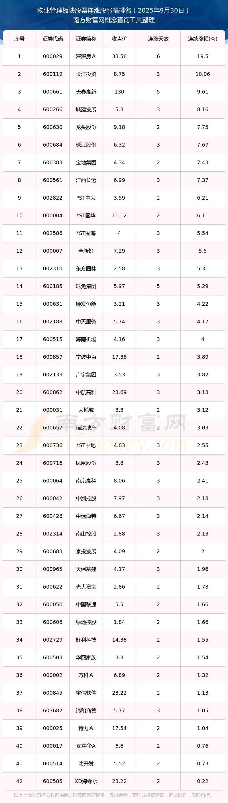 2025年9月30日物業(yè)管理板塊股票連漲股漲幅排名