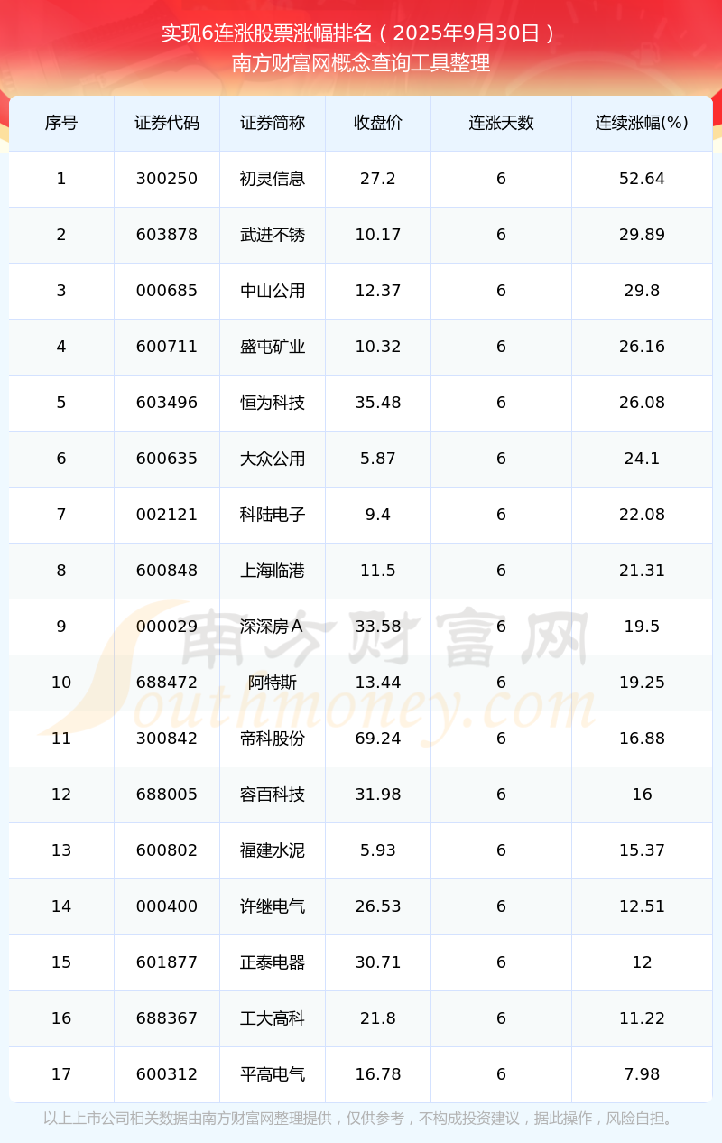 根據(jù)南方財(cái)富網(wǎng)概念查詢工具數(shù)據(jù)統(tǒng)計(jì),截止2025年9月30日收盤,共有17只個(gè)股實(shí)現(xiàn)6天連漲。其中連續(xù)漲幅較大的個(gè)股有初靈信息、武進(jìn)不銹、中山公用等,連續(xù)漲幅分別為52.64%、29.89%、29.80%。
