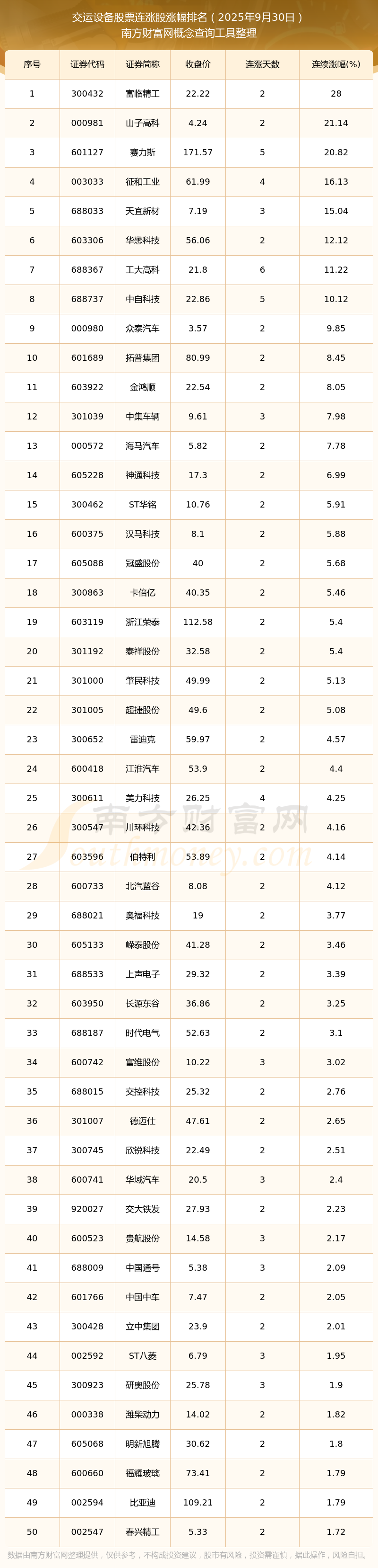 根據(jù)南方財富網概念查詢工具數(shù)據(jù)統(tǒng)計,截止2025年9月30日收盤,交運設備股票共有66只個股實現(xiàn)連漲。其中連續(xù)漲幅較大的個股有富臨精工、山子高科、賽力斯等,連續(xù)漲幅分別為28.00%、21.14%、20.82%。