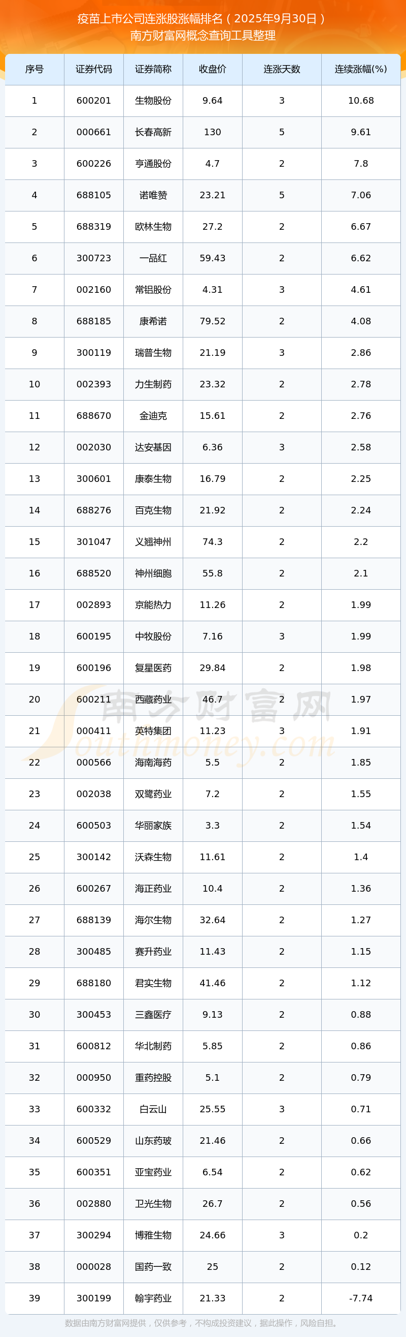 根據(jù)南方財(cái)富網(wǎng)概念查詢工具數(shù)據(jù)統(tǒng)計(jì),截止2025年9月30日收盤,疫苗上市公司共有39只個(gè)股實(shí)現(xiàn)連漲。其中連續(xù)漲幅較大的個(gè)股有生物股份、長(zhǎng)春高新、亨通股份等,連續(xù)漲幅分別為10.68%、9.61%、7.80%。