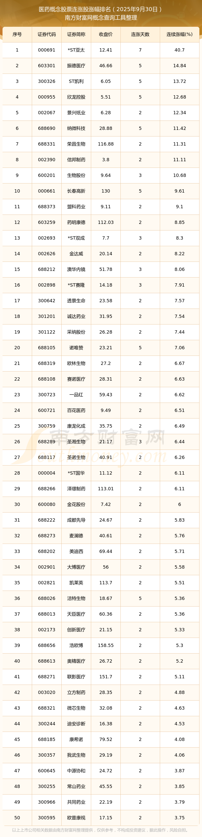 2025年9月30日醫(yī)藥概念股票連漲股漲幅排名