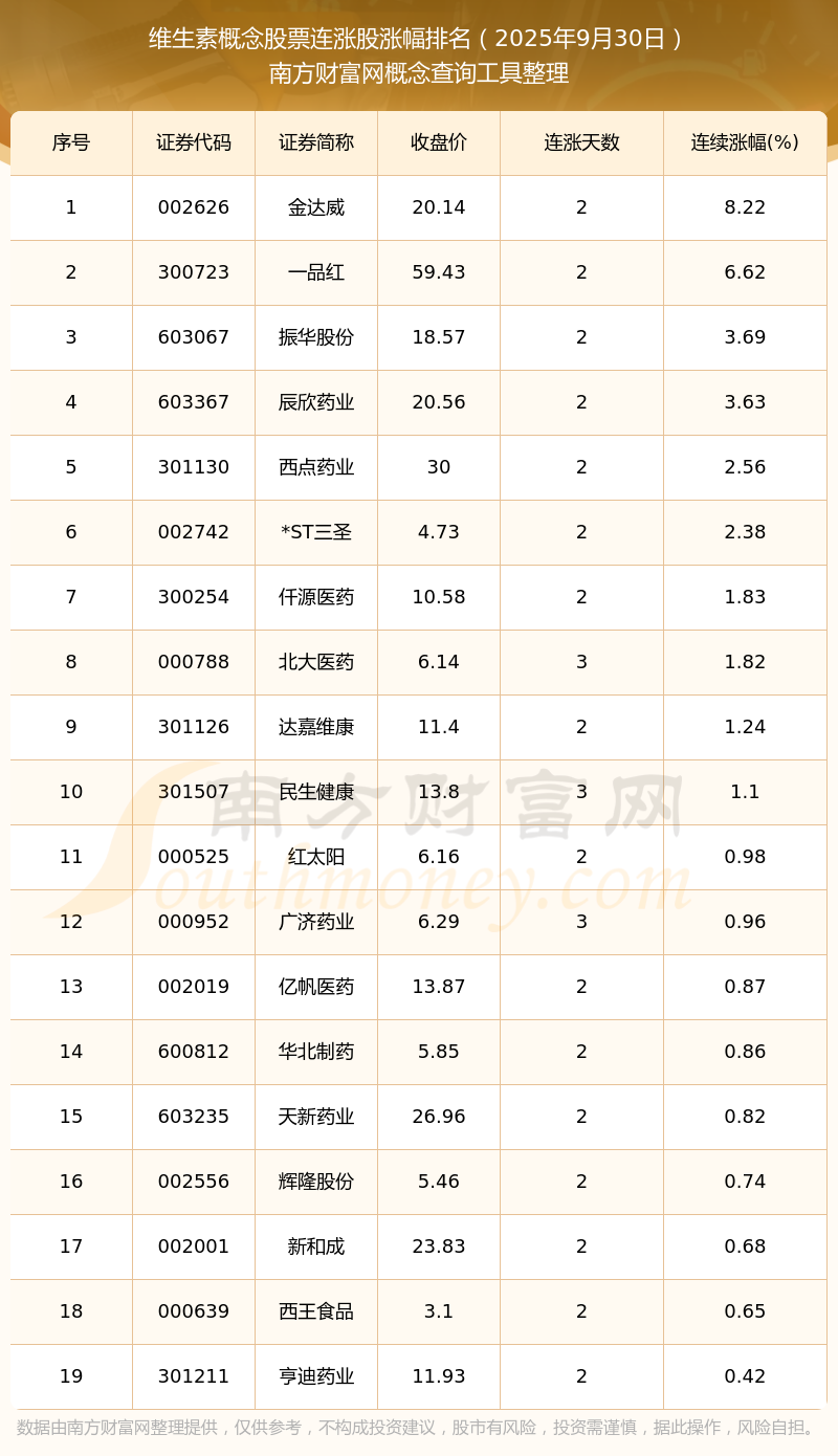 2025年9月30日維生素概念股票連漲股漲幅排名