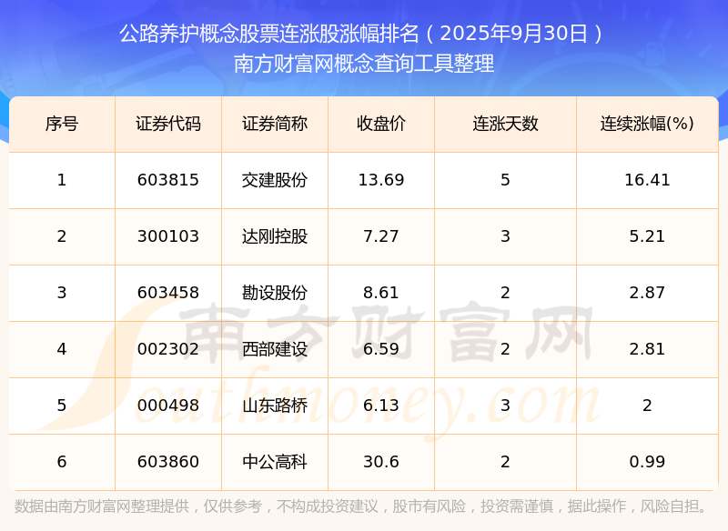 2025年9月30日公路養(yǎng)護概念股票連漲股漲幅排名
