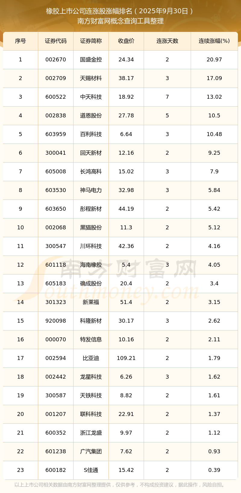 2025年9月30日橡膠上市公司連漲股漲幅排名