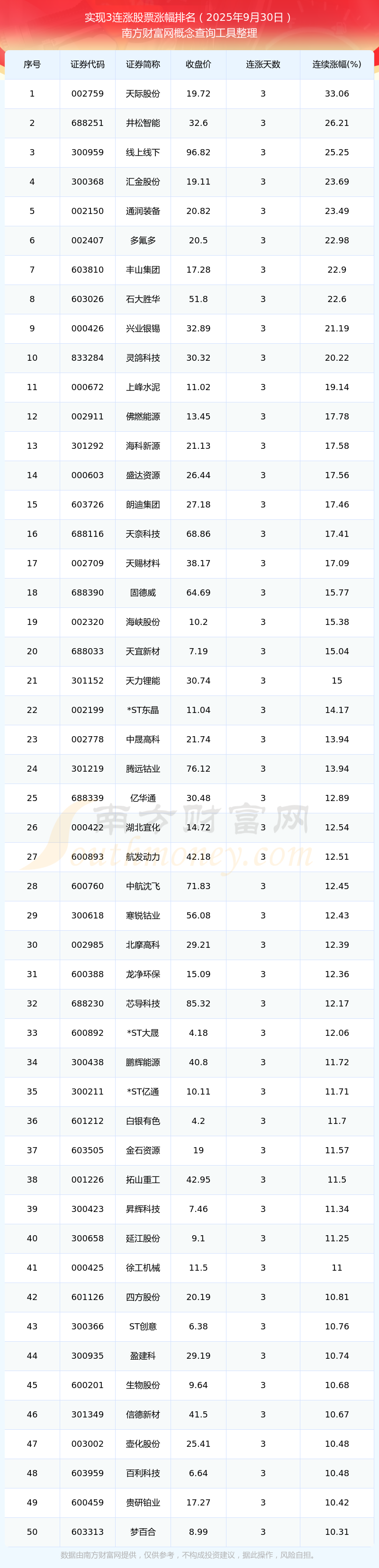 2025年9月30日實(shí)現(xiàn)3連漲股票漲幅排名