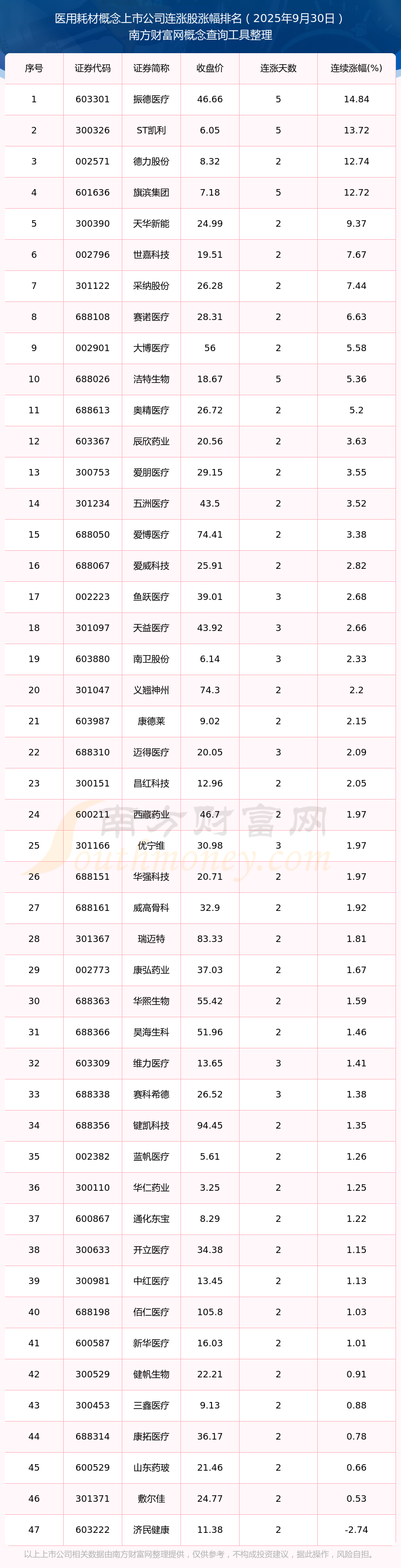 2025年9月30日醫(yī)用耗材概念上市公司連漲股漲幅排名