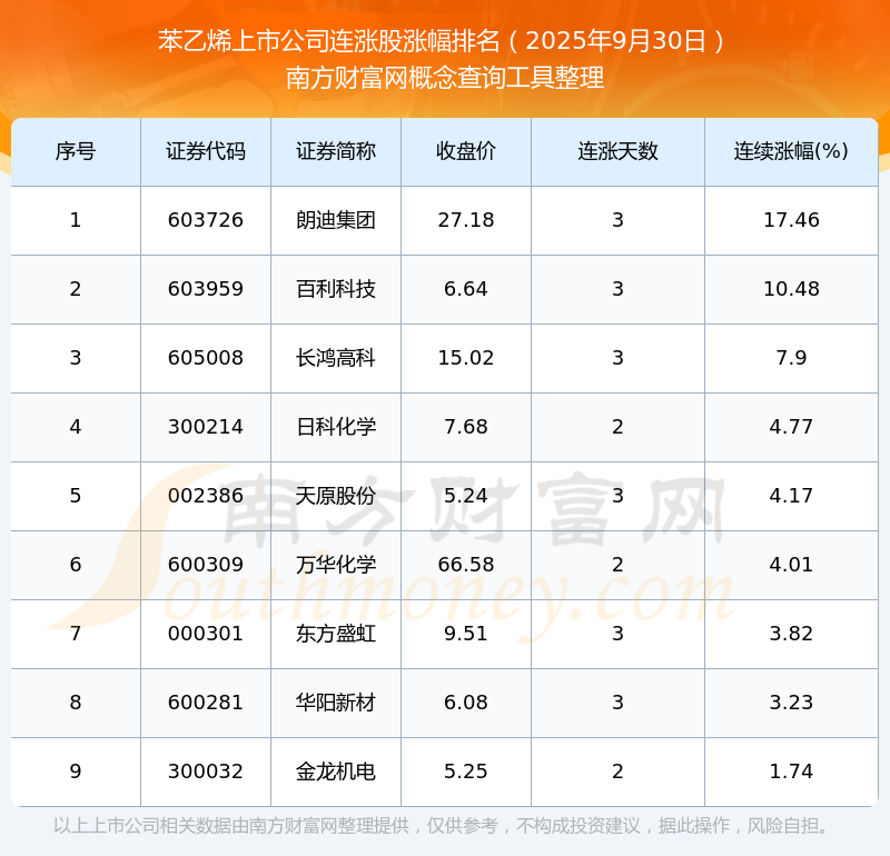 2025年9月30日苯乙烯上市公司連漲股票漲幅排名