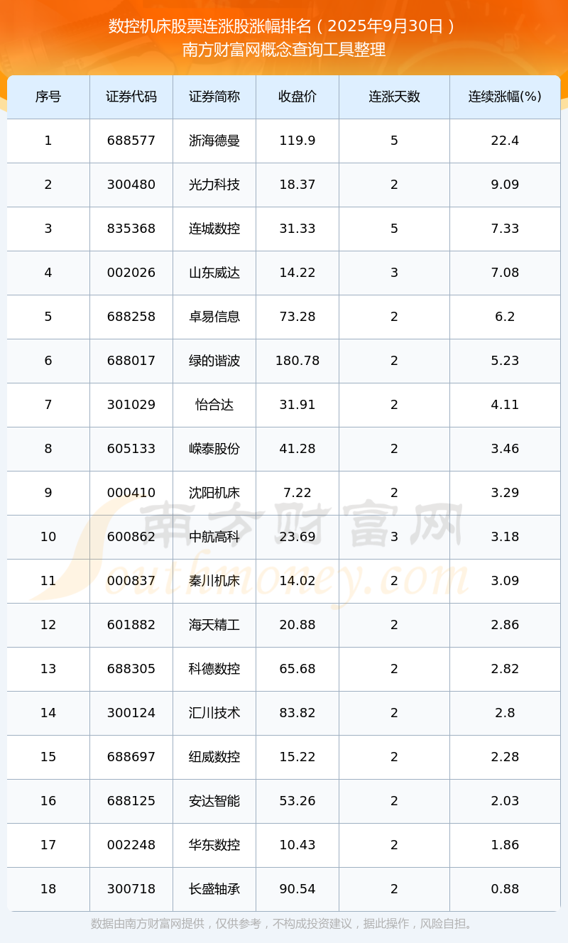 2025年9月30日數(shù)控機床股票連漲股漲幅排名