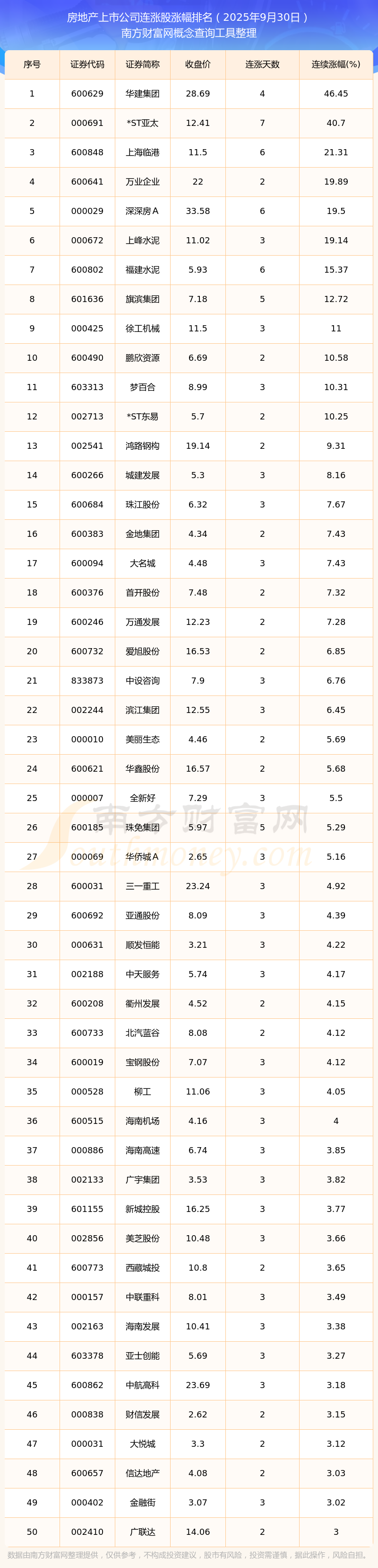 2025年9月30日房地產(chǎn)上市公司連漲股漲幅排名