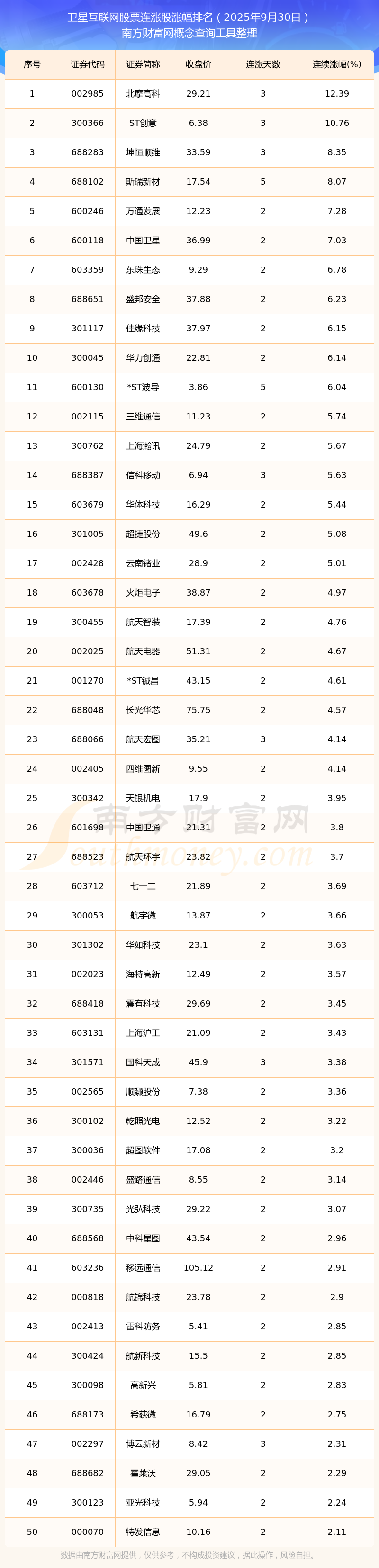 2025年9月30日衛(wèi)星互聯(lián)網(wǎng)股票連漲股漲幅排名