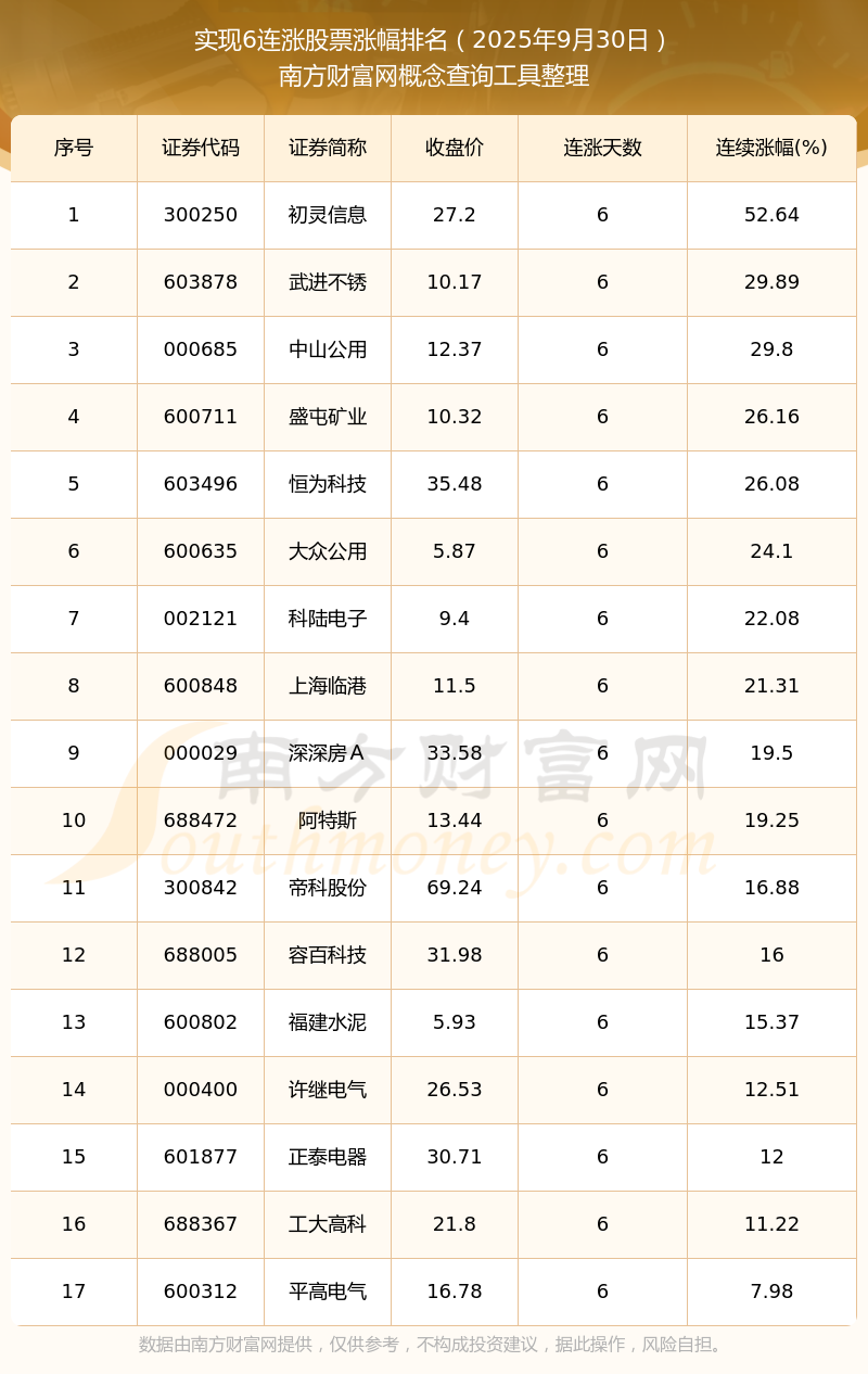 2025年9月30日實(shí)現(xiàn)6連漲股票漲幅排名