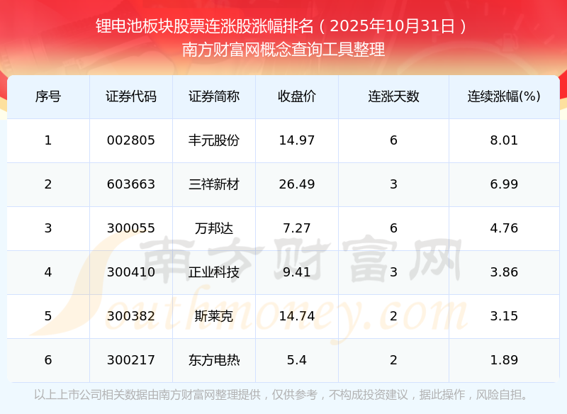 根據(jù)南方財(cái)富網(wǎng)概念查詢工具數(shù)據(jù)統(tǒng)計(jì),截止2025年10月31日收盤,鋰電池板塊股票共有6只個(gè)股實(shí)現(xiàn)連漲。其中連續(xù)漲幅較大的個(gè)股有豐元股份、三祥新材、萬邦達(dá)等,連續(xù)漲幅分別為8.01%、6.99%、4.76%。