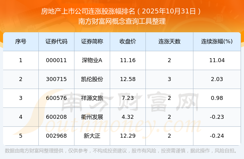 根據(jù)南方財(cái)富網(wǎng)概念查詢工具數(shù)據(jù)統(tǒng)計(jì),截止2025年10月31日收盤,房地產(chǎn)上市公司共有5只個(gè)股實(shí)現(xiàn)連漲。其中連續(xù)漲幅較大的個(gè)股有深物業(yè)A、凱倫股份、祥源文旅等,連續(xù)漲幅分別為11.04%、2.03%、0.98%。