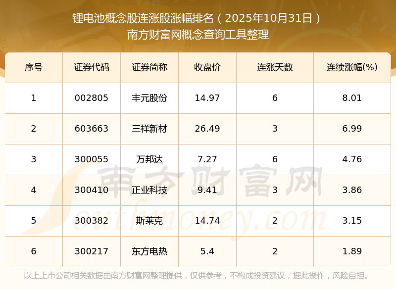 根據(jù)南方財富網(wǎng)概念查詢工具數(shù)據(jù)統(tǒng)計,截止2025年10月31日收盤,鋰電池概念股共有6只個股實現(xiàn)連漲。其中連續(xù)漲幅較大的個股有豐元股份、三祥新材、萬邦達等,連續(xù)漲幅分別為8.01%、6.99%、4.76%。