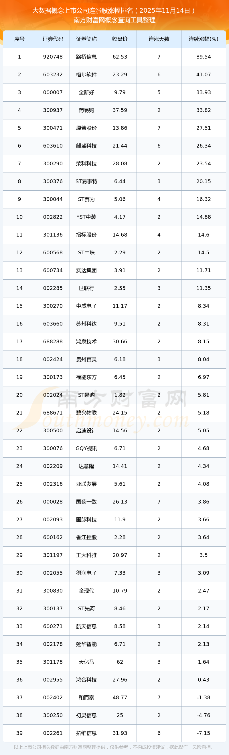 2025年11月14日大數(shù)據(jù)概念上市公司連漲股漲幅排名
