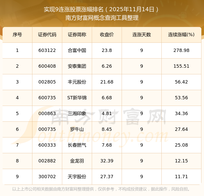 2025年11月14日實(shí)現(xiàn)9連漲股票漲幅排名