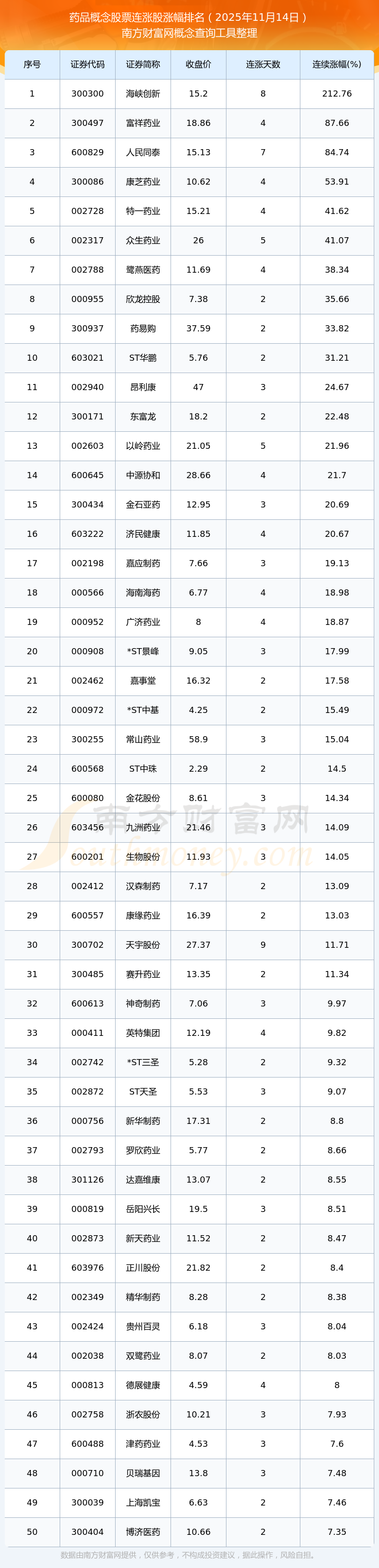 2025年11月14日藥品概念股票連漲股漲幅排名