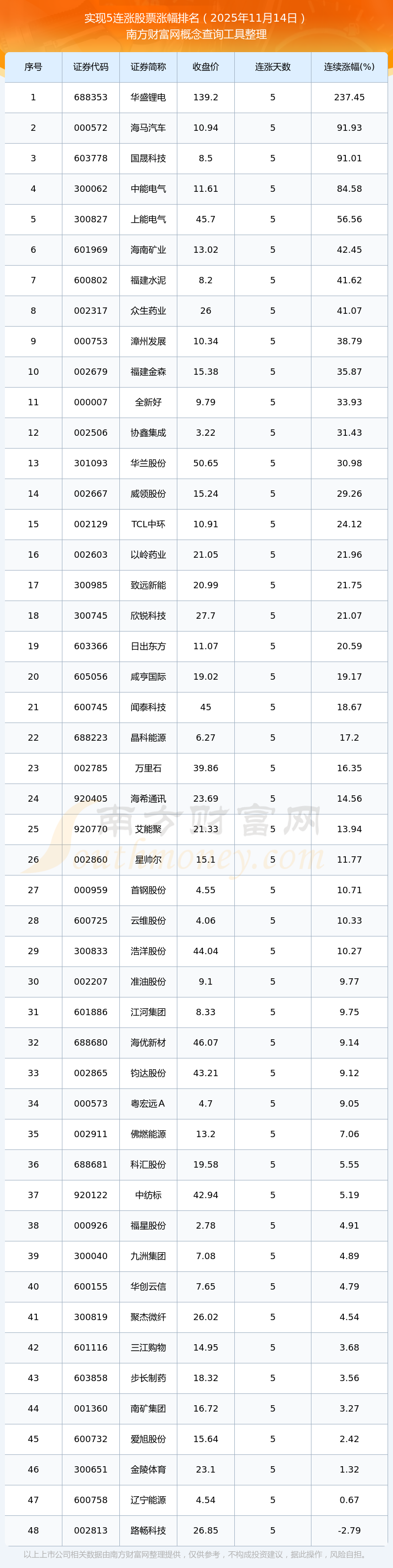 2025年11月14日實現(xiàn)5連漲股票漲幅排名