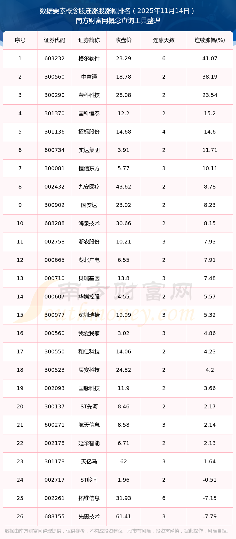 2025年11月14日數(shù)據(jù)要素概念股連漲股漲幅排名