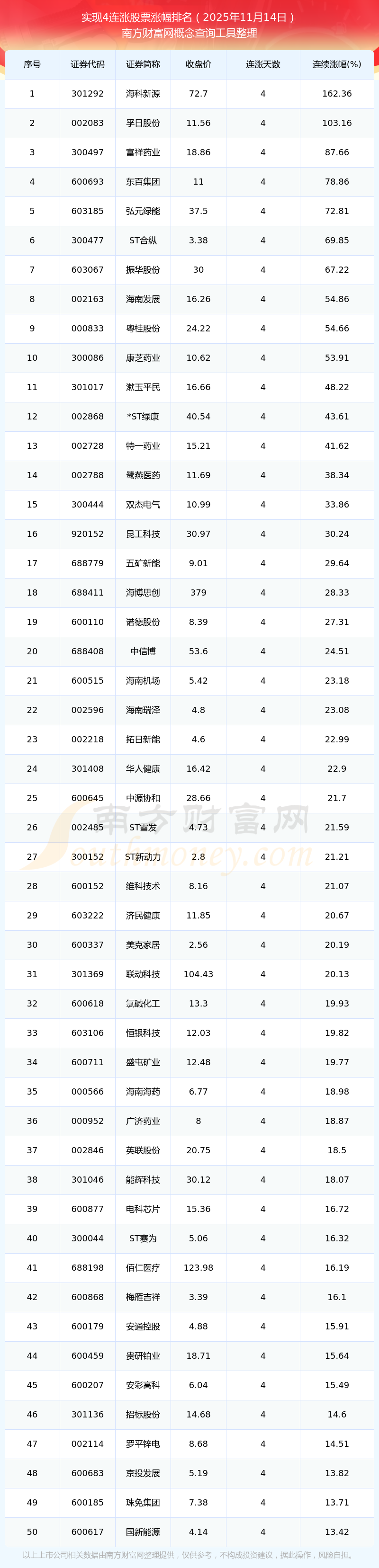2025年11月14日實(shí)現(xiàn)4連漲股票漲幅排名