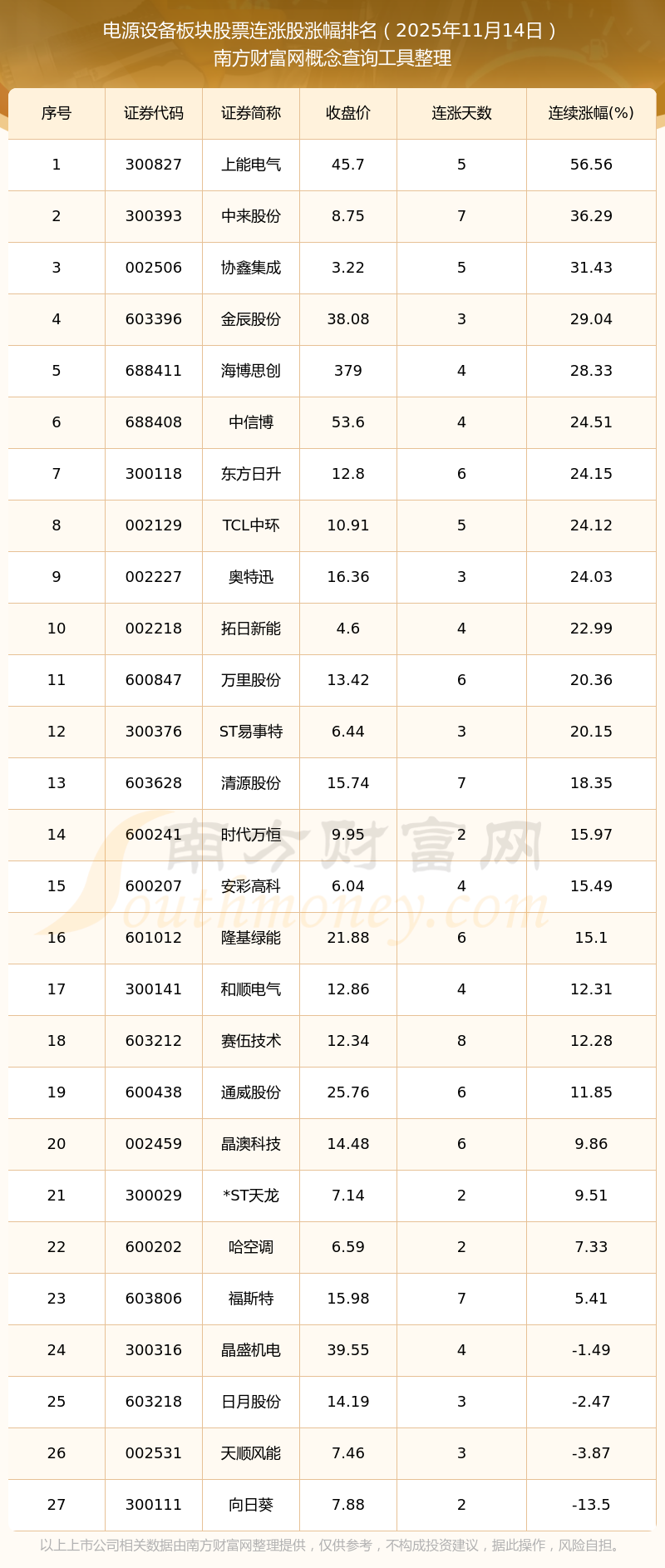 根據(jù)南方財(cái)富網(wǎng)概念查詢工具數(shù)據(jù)統(tǒng)計(jì),截止2025年11月14日收盤,電源設(shè)備板塊股票共有27只個(gè)股實(shí)現(xiàn)連漲。其中連續(xù)漲幅較大的個(gè)股有上能電氣、中來(lái)股份、協(xié)鑫集成等,連續(xù)漲幅分別為56.56%、36.29%、31.43%。